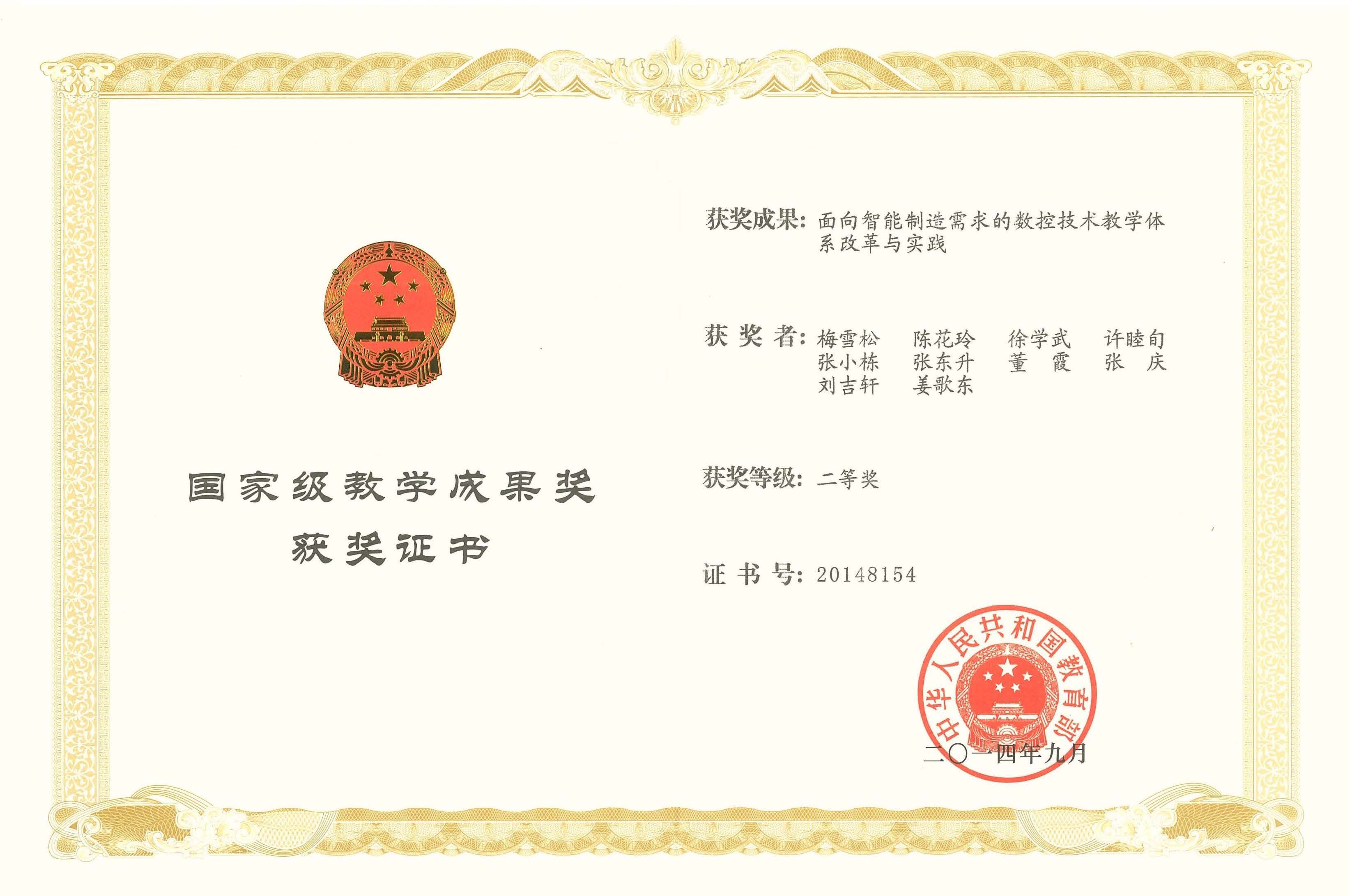 面向智能制造需求的数控技术人才培养体系改革与实践,2014年国家教学成果二等奖,国务院 -