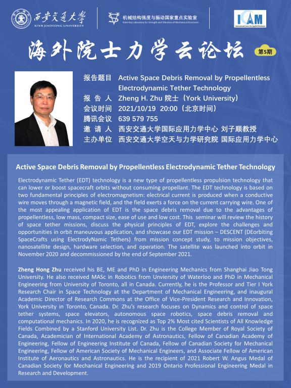 October/19/2021:Prof.Zheng H.Zhu gave a lecture titled"Active Space Debris Removal by Propellentless Electrodynamic Tether Technology".