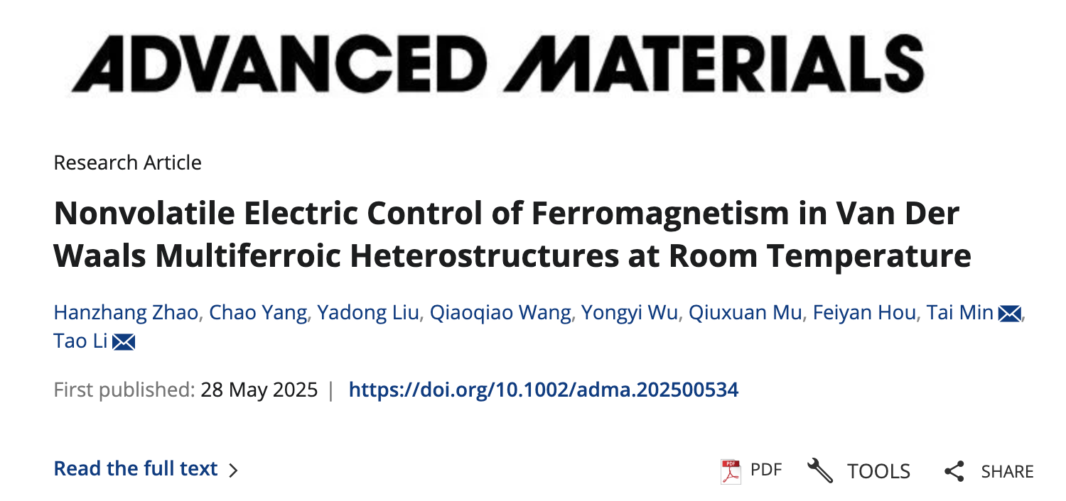 该成果以《室温条件下范德华多铁异质结构中铁磁性的非易失性电场调控》(Nonvolatile Electric Control of Ferromagnetism in Van Der Waals Multiferroic Heterostructures at Room Temperature)为题,5月28日在线发表于国际材料领域知名期刊《先进材料》(Advanced Materials)。华体会 iOS下载材料学院博士研究生赵含章为论文第一作者,闵泰教授与李桃教授为共同通讯作者。