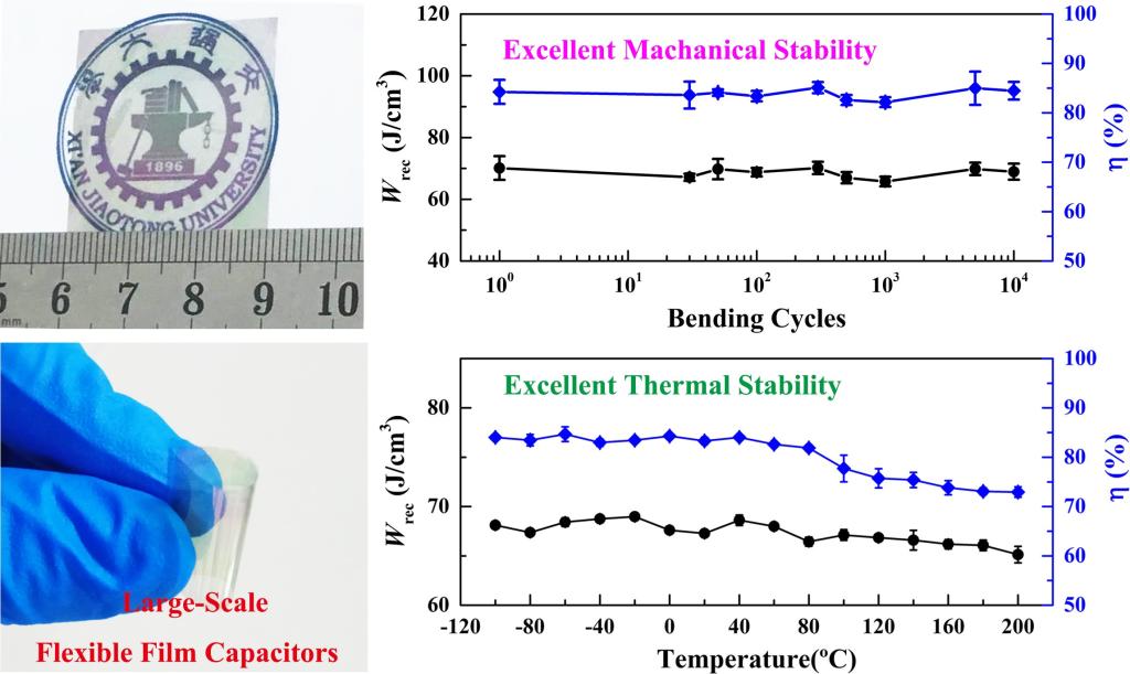 上述研究成果以“Flexible lead-free oxide film capacitors with ultrahigh energy storage performances in extremely wide operating temperature”为题发表在国际知名期刊Nano Energy (IF:13.12)上。西安交大微电子学院博士生梁仲帅为第一作者,刘明副教授和马春蕊副教授为共同通讯作者。参与该工作的还有贾春林工作室的路璐高级工程师和贾春林教授,前沿学院的娄晓杰教授和西安电子科技大学的陆小力教授。西安交大是该论文的第一作者和通讯作者单位。