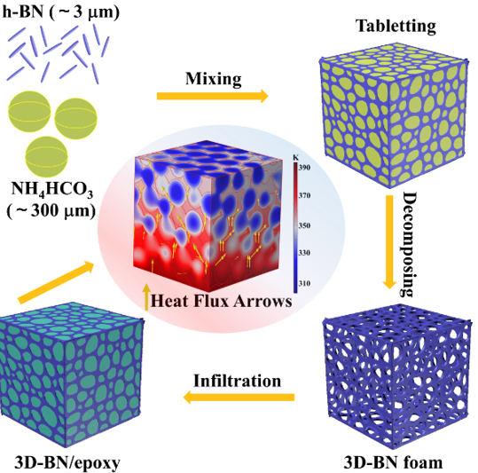 针对上述问题,工作室汪宏教授采用碳酸氢铵作为牺牲材料,提出了一种简便且通用的方法来构造三维氮化硼泡沫(3D-BN),再通过环氧树脂填充3D-BN获得复合材料。该复合材料不仅采用的方法简单,且可以大大提高复合材料的热导率。所制备的复合材料的纵向热导率最高可达6.11 W m-1K-1。作者通过有限元方法进行了进一步分析表明,高导热率归因于3D-BN泡沫,其中BN泡沫仅由片状氮化硼组成,氮化硼与氮化硼在压力下紧密连接,其在复合材料中能够提供声子传输的快速通道。该复合材料同时具有优异的绝缘性能,低的介电常数和介电损耗。