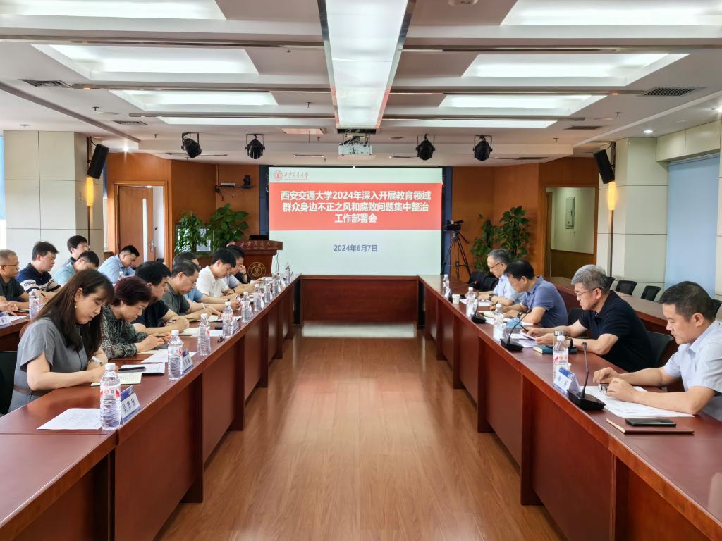 6月7日下午,西安交大召开教育领域群众身边不正之风和腐败问题集中整治工作部署会,深入贯彻习近平总书记和党中央决策部署,认真落实中央纪委国家监委和陕西省委、省纪委省监委工作要求,对全校集中整治工作进行系统安排,学校党委副书记、纪委书记、国家监委驻校监察专员马博虎,党委副书记孙早出席会议并讲话,校纪委副书记胡建平主持会议。
