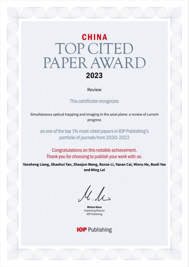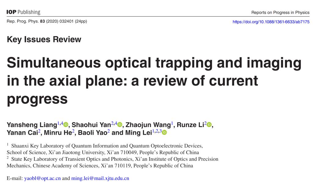 近期,英国物理学会出版社(IOP Publishing)公布2023年“中国高被引文章奖”获奖名单,以表彰中国研究人员在全球科学界的影响力以及他们对物理学的贡献。西安交大物理学院雷铭教授团队在Reports on Progress in Physics(IF=18.1)的综述论文“轴平面同时光学捕获与成像”(Simultaneous optical trapping and imaging in the axial plane: a review of current progress)获得IOP Publishing的前1%高被引荣誉。华体会 iOS下载物理学院为论文第一通讯单位,第一作者是华体会 iOS下载物理学院梁言生副教授,共同第一作者是中国科学院西安光学精密机械研究所严绍辉研究员,通讯作者是西安交大物理学院雷铭教授(lead contact)和中国科学院西安光学精密机械研究所姚保利研究员。