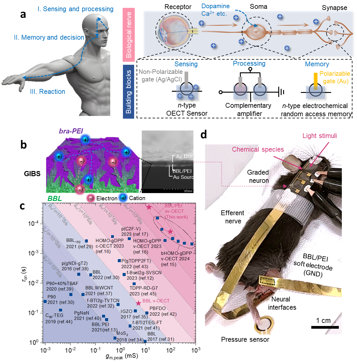 近年来,随着脑科学、再生医学、人工智能等领域的迅速发展与深度融合,生物神经修复、脑机接口等技术正逐渐从设想变为现实。人工神经是用于临床神经修复和脑机接口的重要技术,需要具备能够放大、记忆、整合、传递生物体内微弱且高频的信号(高达1千赫兹、低于50毫伏)的能力。这要求人工神经同时具备快速响应、高放大能力和良好生物相容性,并实现感知-处理-记忆功能的一体化融合。传统硅基电路虽然性能强大,但缺乏对神经递质等生物化学信号的响应能力,无法实现化学调控,且电路结构复杂、硬质,生物相容性差、难以与柔软神经组织长期稳定连接等关键问题。