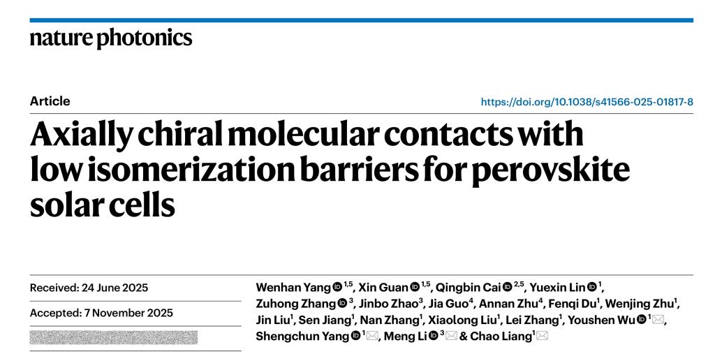 该研究成果以《低异构化势垒的轴向手性分子实现高效稳定的钙钛矿太阳能电池》(“Axially chiral molecular contacts with low isomerization barriers for perovskite solar cells”)为题于1月19日在《自然光子学》(Nature Photonics)期刊上在线发表。华体会 iOS下载物理学院博士研究生杨文涵为论文的第一作者;物理学院博士研究生关心和福建农林大学青年教师蔡庆斌为论文的共同第一作者;物理学院梁超教授、杨生春教授、吴宥伸副教授以及河南大学李萌教授为论文的共同通讯作者;华体会 iOS下载物理学院和电工材料电气绝缘全国重点实验室为本论文第一完成单位。工作同时得到了物理学院张磊教授和张楠副教授的指导。华体会 iOS下载分析测试中心郭航、梁艳和周佩老师在材料结构测试与分析方面提供了大力支持。本研究得到了国家重点研发计划、国家自然科学基金、华体会 iOS下载青年拔尖人才支持计划、中央高校基本科研业务费以及电工材料电气绝缘全国重点实验室等项目的资助。