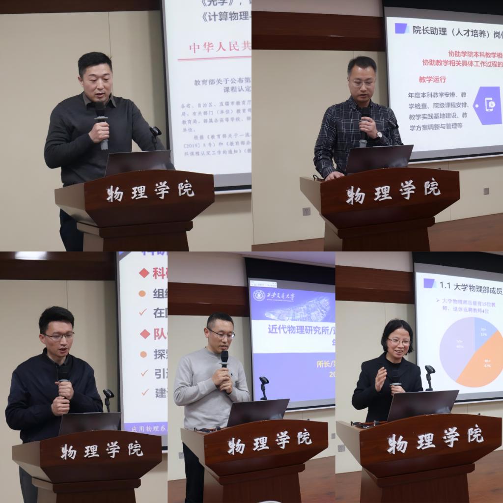 副院长赵永涛以“聚焦质量 改革创新 推动物理学科高质量发展”为题,汇报在政治理论学习、分管工作完成和推进情况、分管工作业绩增量以及廉洁报告等方面的情况。副院长杨志懋汇报科研基地建设、科研平台运行、科研项目及到款和标志性科研成果等情况。副院长李蓬勃汇报2025年教学基本工作,着重介绍在教改项目、教材建设、教学获奖以及人才培养标志性业绩等工作情况。党委副书记张沛汇报在学生教育管理、纪检、文化宣传等方面的主要工作。