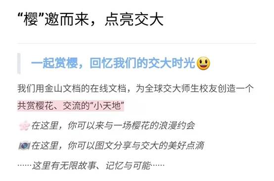 “相约星期三”推出樱花节专场,是否有你驻足聆听的身影;“樱花季云诵读”线上朗读,邀请师生、家属共同参与;金山文档与浪潮工作室携手打造共赏樱花、共同互动的“小天地”,参与活动还有金山文档会员精美文创产品相送。