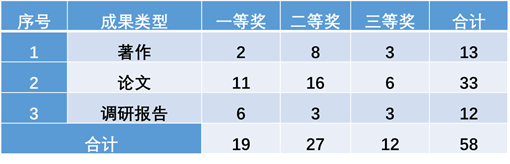 从成果形式来看,著作类获奖成果13项,一等奖2项;论文类获奖成果33项,一等奖11项;调研报告类获奖成果12项,一等奖6项。