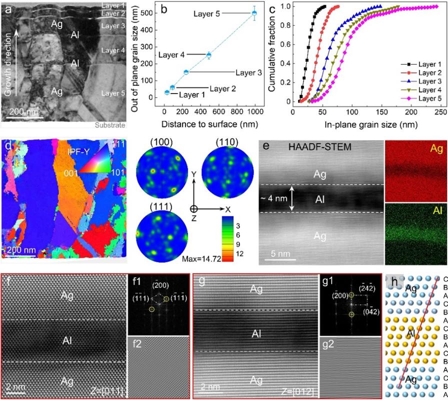 图1 Ag/Al共格梯度多层薄膜的微观结构。a,薄膜截面TEM照片;b-c,Ag层的面外与面内晶粒尺寸分布图;d,薄膜晶体取向图及相应极图;e,Ag/Al界面的高分辨STEM图像及对应能谱图;f–g,沿<011>和<012>带轴的界面原子尺度图像,表明Ag/Al界面具有立方-立方取向关系;h,共格界面结构示意图。