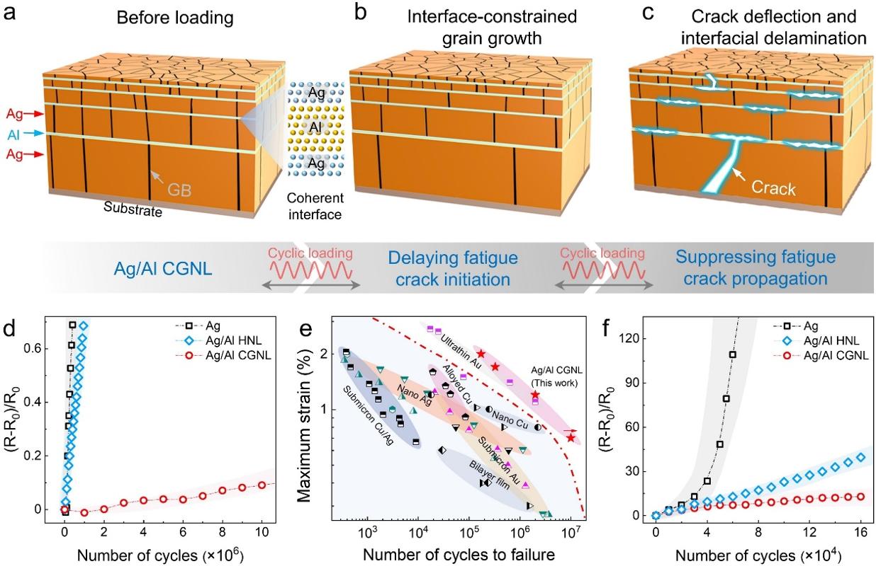 柔性电子技术在航空航天、人机交互、生物医疗及清洁能源等领域具有广阔的应用前景。金属薄膜作为其中的关键导体材料,承担着电连接与信号传输的核心功能,然而其在实际应用中长期面临循环变形导致的疲劳问题。传统纳米晶金属薄膜容易发生晶粒异常长大和应变局域化,导致疲劳裂纹过早萌生并快速扩展,最终引发电阻急剧上升乃至电路完全失效。尽管合金化与多层化等方法能改善薄膜抗高周疲劳性能,却往往以牺牲电学延展性和低周疲劳寿命为代价,难以实现二者的协同优化。这一瓶颈严重制约了柔性电子器件的使用寿命与功能稳定性,成为其走向工程应用的核心障碍。因此,如何有效控制晶粒长大、显著延迟裂纹萌生、抑制裂纹扩展,从而全面提升金属薄膜的抗疲劳性能,是国际性关键科学与技术难题。