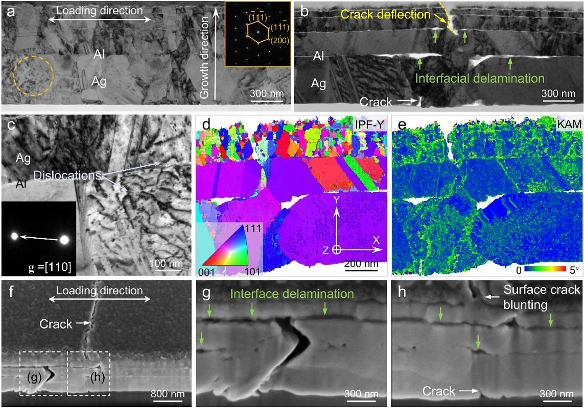 图2 Ag/Al共格梯度多层薄膜的疲劳损伤特征。a,裂纹萌生前的TEM图;b,裂纹扩展后的TEM图;c,Ag/Al界面结构的局部放大图;d,图b损伤区域的晶体取向图;e,图d对应的局部取向差图;f–h,裂纹扩展后的薄膜截面SEM图,展现出显著的裂纹钝化、界面剥离及裂纹偏转现象。