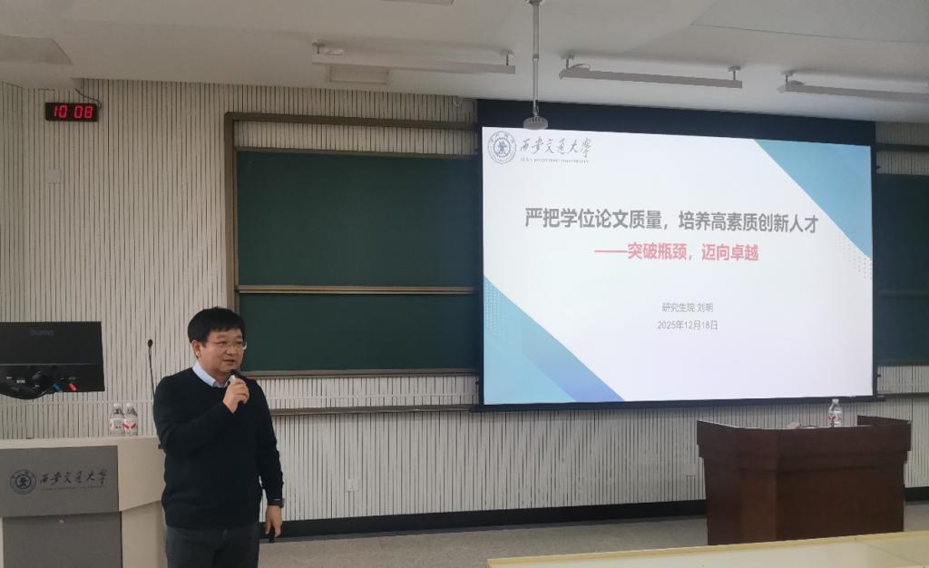 培训环节,刘明围绕“严把学位论文质量,培养高素质创新人才”作专题报告。报告系统梳理了近年来学位论文抽检的总体情况,并结合典型实例进行了深入剖析。他详细解读了学校学位授予的相关政策条例,从授予基本条件、审核全流程、学术规范要求到违规处理办法等方面进行了全方位阐释,展示了学校构建的多维度、客观化论文评审与质量保障机制。