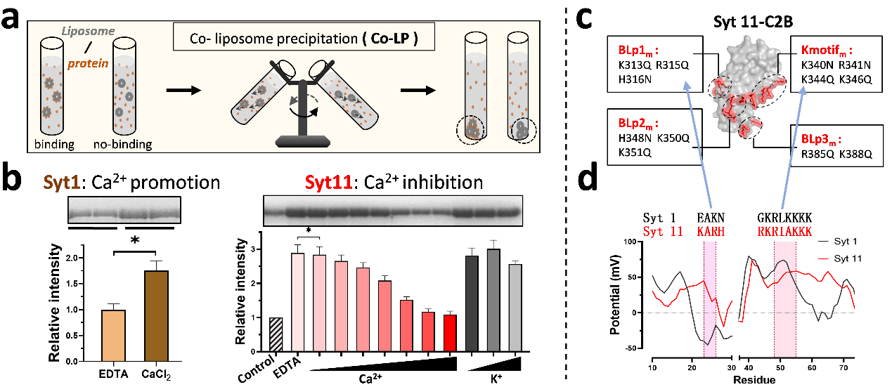 研究团队使用脂质体共沉淀(co-LP)方法分别检测CaR-Syt1与CaT-Syt11与脂质体的相互作用。两者都能在无Ca2+环境中结合脂质体;作为CaR成员,Ca2+可促进Syt1与质膜的结合;而有趣的是,作为CaT成员,Syt11与质膜的结合也表现出严格的Ca2+依赖性,可被Ca2+强烈抑制。进一步利用点突变进行筛查发现,Syt11的C2B上存在多个碱性区域,共同、冗余地保证Syt蛋白与膜的结合,其中还包括一处仅在CaT-Syts中呈碱性、而在CaR-Syts中呈酸性的独特位点。这些结果表明,Syt蛋白与磷脂膜存在广泛的不同模式的相互作用,而Ca2+对CaR与CaT两类Syts的调节作用刚好相反:促进CaR-Syts与质膜的结合,而抑制CaT-Syts与质膜的互作。