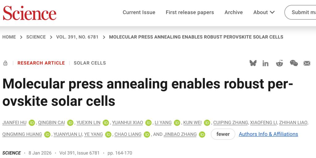 西安交大新年首篇《科学》!钙钛矿电池领域联合研究再次实现重大突破
