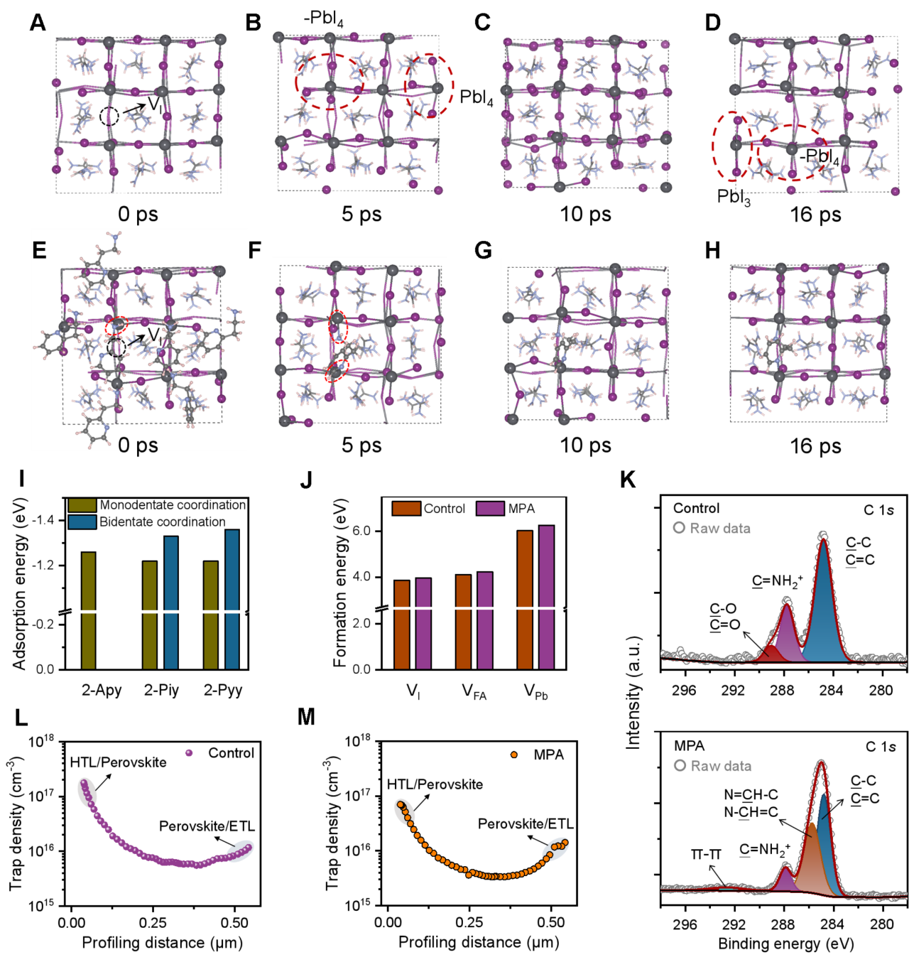 图2 MPA策略功能机制的理论模拟和实验验证。(A至D)对照薄膜在423 K模拟热退火条件下的快照。(E至H)MPA处理薄膜在423 K模拟热退火条件下的快照,揭示了增强的结构稳定性和降低的动态无序性。(I)具有不同配位基序的配体工程化吡啶基分子在钙钛矿表面的吸附能。(J)对照薄膜和MPA处理薄膜中空位缺陷的形成能。(K)退火后对照薄膜和MPA处理薄膜的C 1s高分辨率XPS谱图。(L)和(M)分别为对照组和经MPA处理组钙钛矿太阳能电池的深度依赖性陷阱密度分布图。