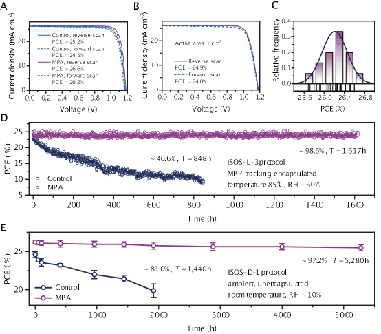 图4 MPA策略的光伏性能和普适性。(A)采用传统溶液法钝化和固态MPA策略制备的钙钛矿太阳能电池的J-V曲线。(B)基于MPA策略的大尺寸器件(1 cm2)的J-V曲线。(C)器件性能的统计分析,用于测试MPA技术的重复使用性。(D)ISOS-L-3协议下对照组和MPA处理组器件的运行稳定性。(E)ISOS-D-1协议下未封装的对照组和MPA处理组器件在环境条件下避光长期储存稳定性测试。