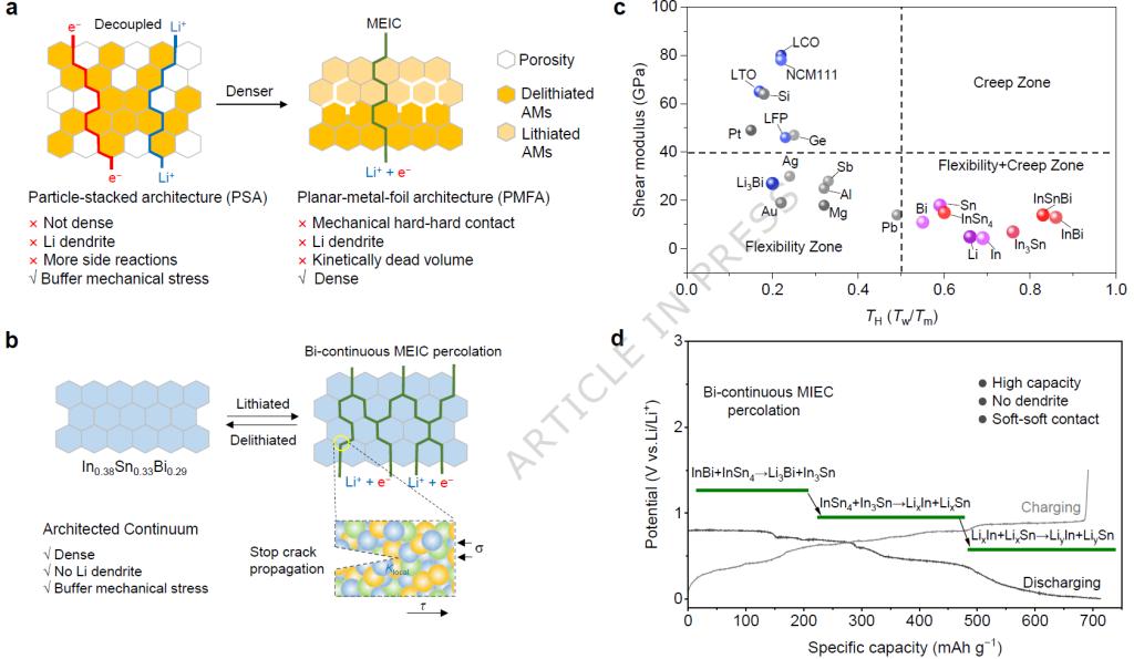 b 结合PSA和PMFA的优点设计了结构化连续体合金,该合金具有双连续混合离子电子传导和软-软接触以缓冲机械应力并阻止基于裂纹的退化 c 各种材料在25°C下的变形机制图 d InSnBi负极锂化过程