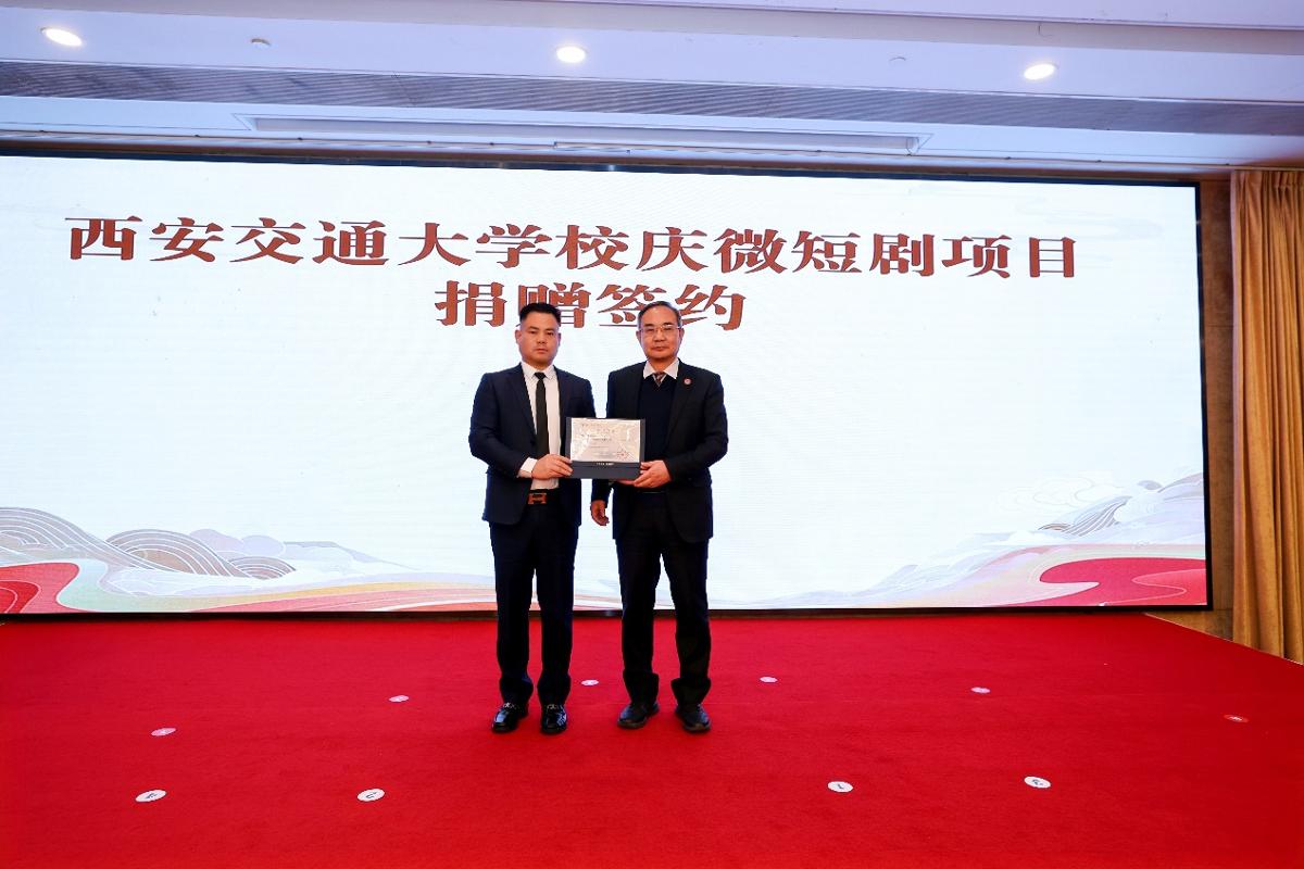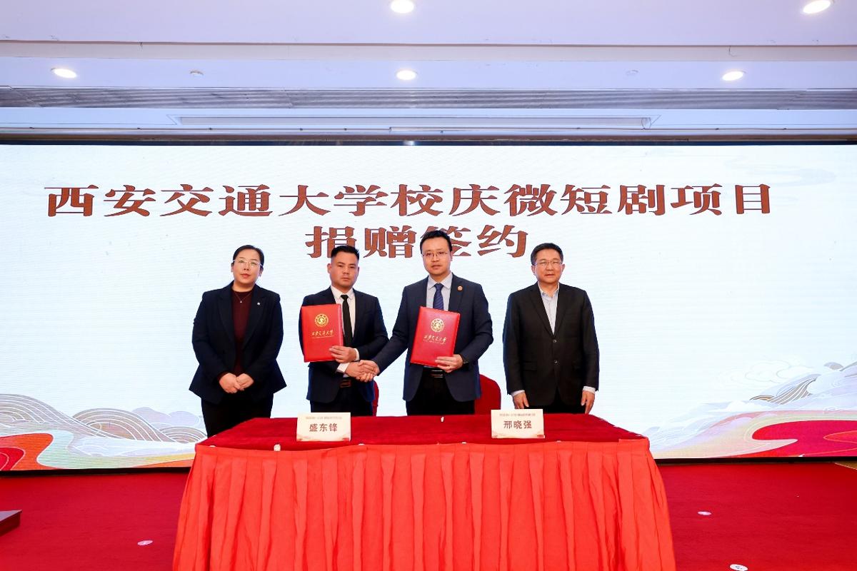 邢晓强与西咸新区嘉园之星酒店管理有限公司董事长盛东锋签署华体会 iOS下载校庆微短剧项目捐赠协议。梅红、西安交大新闻与新媒体学院院长汪文斌见签。成进为捐赠人盛东锋颁发捐赠证书。