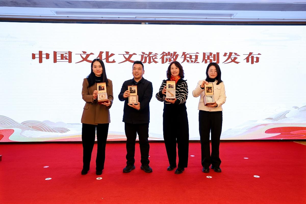 西安曲江影视投资(集团)投资部负责人王蓉宣讲发布中国文化文旅微短剧项目计划。韩棚格,中广联合会微短剧委员会常务副会长、秘书长张跃明,西安曲江影视投资(集团)副总经理李双,陕西黄帝陵文化科技有限公司总经理潘瑞共同“开盲盒”完成启动。