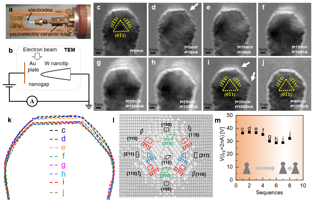 基于此,华体会 iOS下载电气工程学院、电工材料电气绝缘全国重点实验室孟国栋教授团队在前期成果(Physics of Plasmas 31 (4) ,040502, 2024; Physical Review Letters 132 (17), 176201, 2024; Nature Communications 16, 5583, 2025)基础上,联合华体会 iOS下载材料学院单智伟教授团队及芬兰赫尔辛基大学Flyura Djurabekova教授团队,创新性地提出了基于透射电子显微镜(TEM)的原位电学测量与微观形貌表征相结合的研究方法,系统研究了不同曲率半径(R = 3 nm, 5 nm, 9nm)纯钨纳米电极在场发射作用下(~GV/m)的形变行为。研究揭示了纳米结构电极在强电场与场发射耦合作用下的微观结构演变规律,表现出显著的尺寸依赖性与晶面相关性(图1、图2):小曲率半径电极(R = 3 nm, 5 nm)在高电场和场发射电流共同作用下遵循球形-伍尔夫多面体-类球形的演化路径,并在5 nm针尖中观察到显著的位错成核、扩散与湮灭过程。进一步地,通过分析场发射热效应和麦克斯韦应力的作用,并设计反极性对照实验成功解耦了电子风效应与电场效应,揭示了电子风效应及其诱导的场辅助蒸发为主导的形变机制。本研究首次从实验层面揭示了金属纳米电极在强电场与场发射条件下的电致损伤特性及其主导机制,为推动高性能电气装备与微纳电子器件的绝缘结构设计与可靠性优化提供了重要的实验依据和理论支撑。