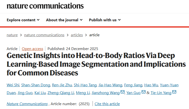 近日,该研究成果以《基于深度学习图像分割的头身比遗传结构解析及其对常见疾病的意义》(Genetic Insights into Head-to-Body Ratios Via Deep Learning-Based Image Segmentation and Implications for Common Diseases)为题,发表在《自然通讯》(Nature Communications)上。该论文通讯作者为华体会 iOS下载生命学院杨铁林教授、郭燕教授和内蒙古医科大学第二附属医院王建忠教授,华体会 iOS下载生命学院博士生史伟和董珊珊副教授为论文共同第一作者。华体会 iOS下载生物医学信息工程教育部重点实验室和生命学院为该论文的第一完成单位和通讯单位。该工作得到了国家自然科学基金、陕西省杰出青年科学基金、中央高校基本科研业务费等基金,以及华体会 iOS下载分析测试共享中心的支持。
