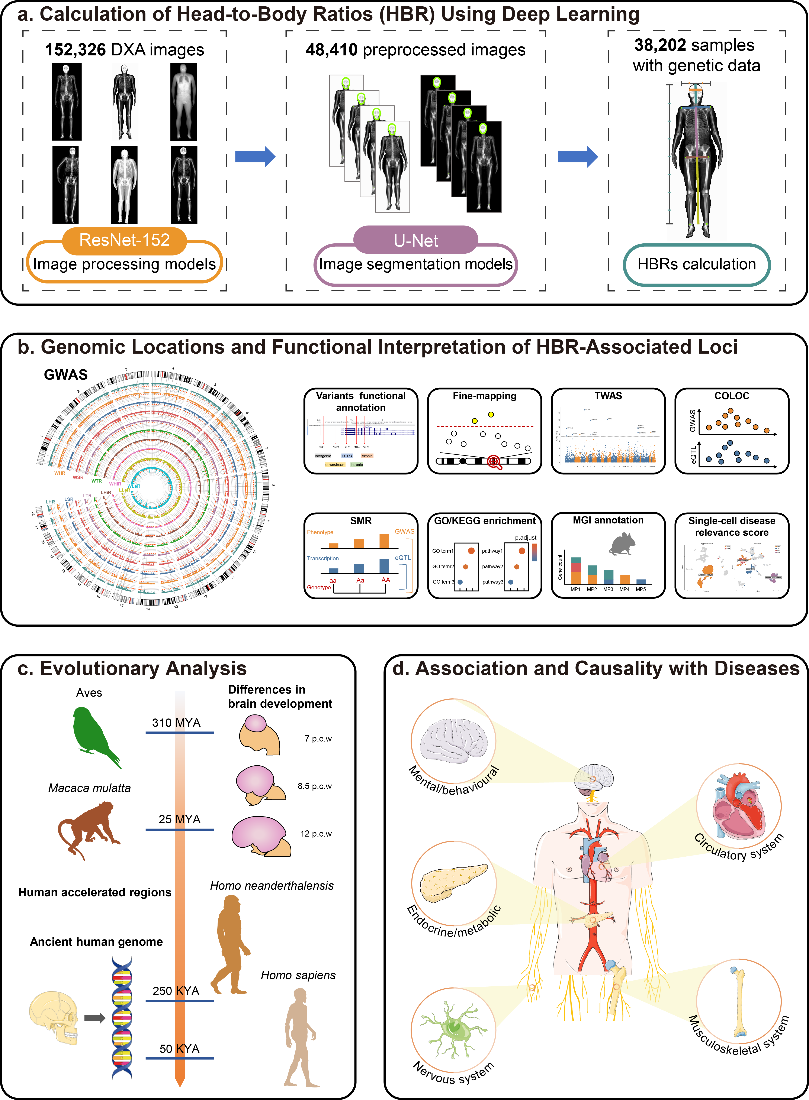 头身比是反映头部相对身体比例并表征脑体异速进化与脑体异速生长的重要人体测量学表型,为解析脑体比例的遗传结构及其临床和演化意义提供了关键切入点。在演化尺度上,头身比呈现出明显的异速进化特征,使现代人类拥有哺乳动物中相对于体型最大的大脑。在个体发育过程中,大脑与身体发育优先级的变化规律,形成了典型的脑体异速生长模式。然而,传统头身比测量依赖人工操作,存在效率低、主观误差大等局限,难以支撑大规模人群研究,导致其遗传结构、演化特征及与疾病关联长期缺乏系统解析。在此背景下,华体会 iOS下载生命学院杨铁林教授团队引入深度学习技术,突破传统测量范式,从大规模医学影像数据中高效、精准地提取头身比表型,为系统研究其遗传结构提供了新的技术路径。