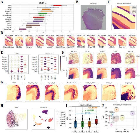 图2.S3RL在DLPFC数据集上的性能评估以及与现有方法的比较(更多分析与比较请查看原文)。A.不同方法聚类性能比较。B-C.DLPFC组织学图像及皮层分层人工标注。D.不同方法空间分区结果对比。E-F.层特异性标记基因的表达分布对比。G.细胞类型在空间中的分布。H.低维嵌入可视化结果。I.S3RL消融实验分析。J.不同方法的运行效率与性能对比。