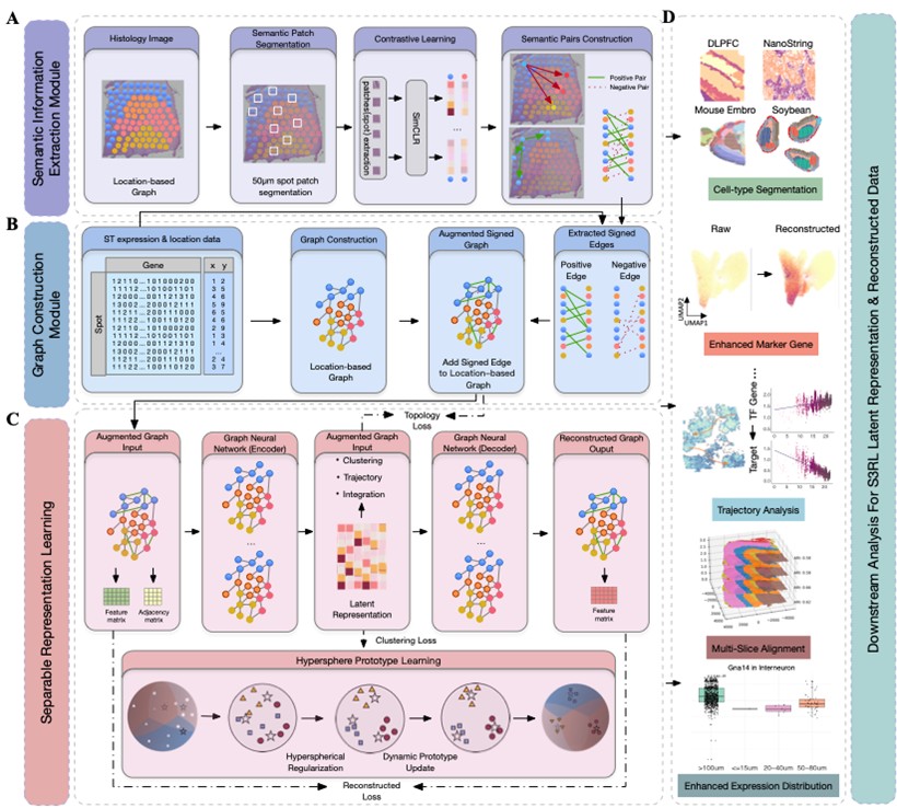 图1 S3RL算法框架。首先利用组织学图像和空间位置信息,识别组织中具有相似语义特征的局部区域,并区分彼此应当聚集或分开的空间关系。然后结合符号图、可分离表征学习以及超球面表示空间原型学习机制,模型自动学习稳定的空间功能“中心”,使细胞自然形成清晰、连贯的空间功能区域,从而准确地刻画组织空间结构。